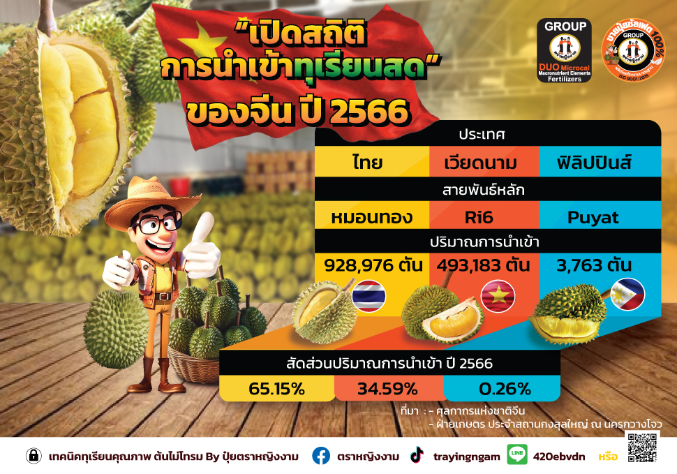 เปิดสถิติ "การนำเข้าทุเรียนสดของจีน" ปี 2566...