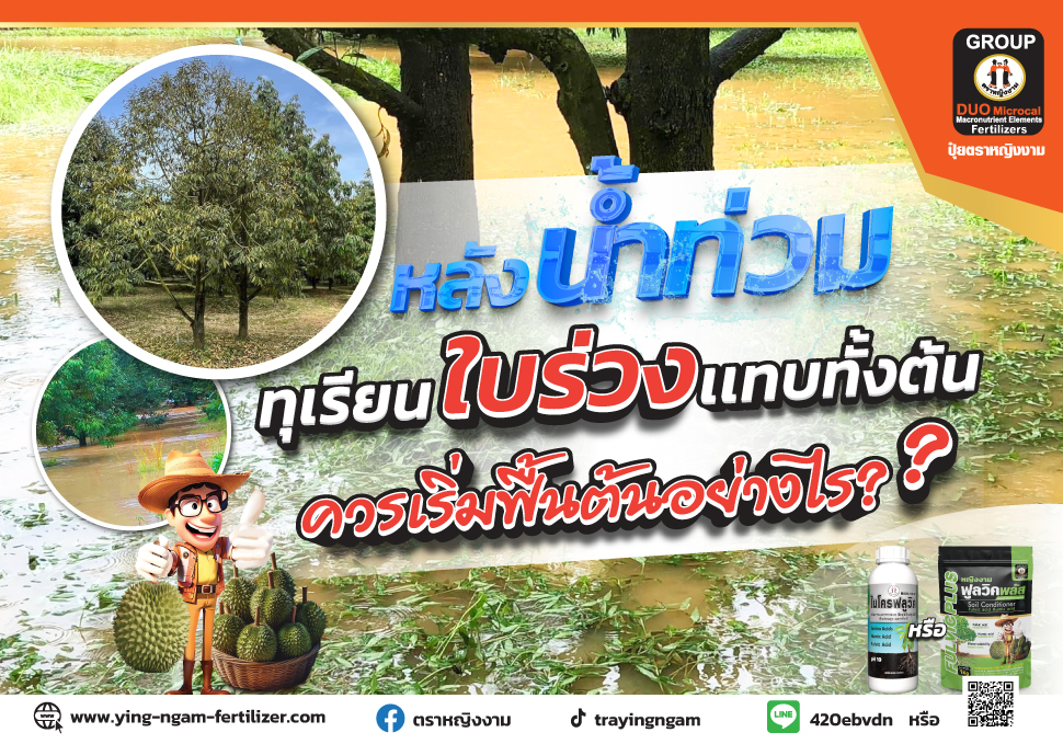 หลังนำ้ท่วมทุเรียนใบร่วงแทบทั้งต้น ควรเริ่มพื้นต้นอย่างไร?...