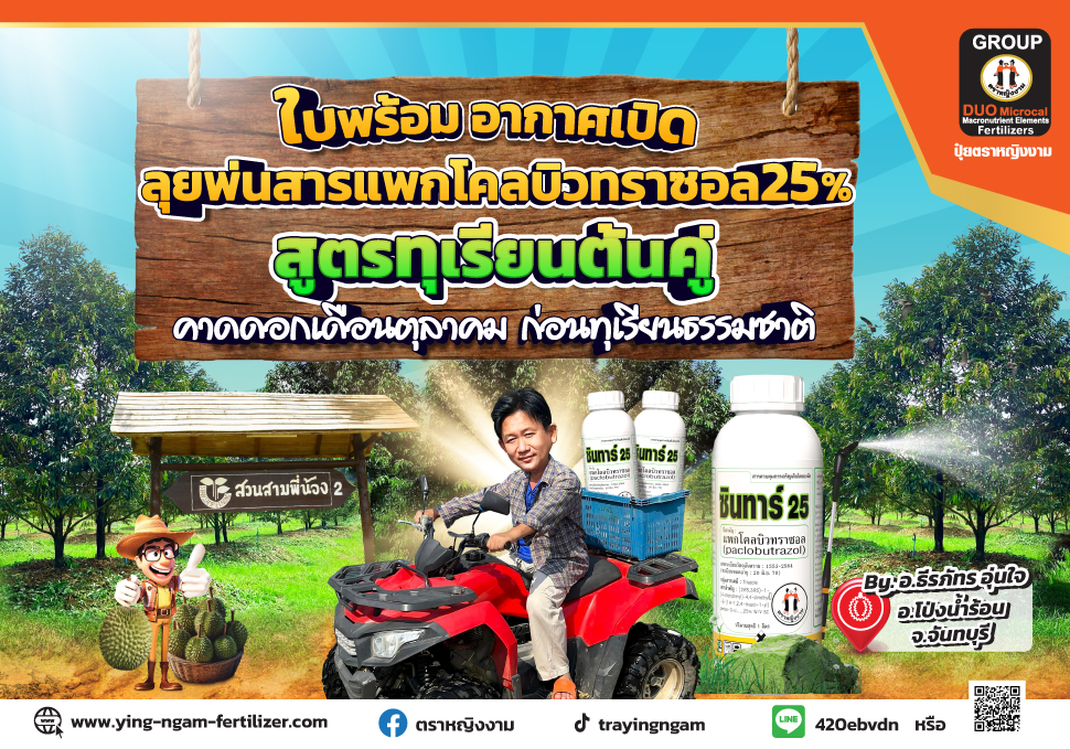 ใบพร้อม อากาศเปิด ลุยพ่นสารแพกโคลบิวทราซอล25% สูตรทุเรียนต้นคู่...